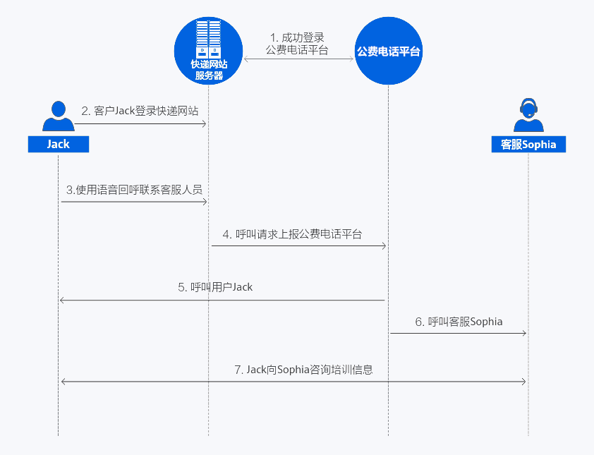 用户Jack在浏览网站时,通过应用软件呼叫客服人员,呼叫请求上报至公费电话平台。公费电话平台分别呼叫主叫Jack和客服Sophia,使主叫和被叫互相通话。详细体验过程如图1所示。