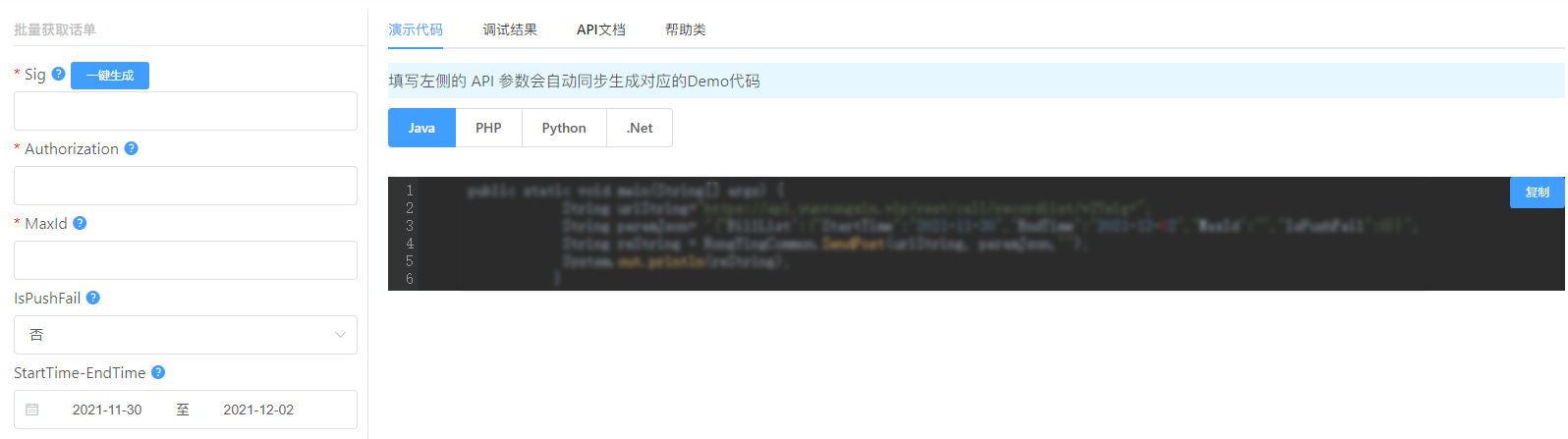 - 根据返回话单的数量取最大的 MaxId 作为新参数再次获取话单,每次最多 100 条;