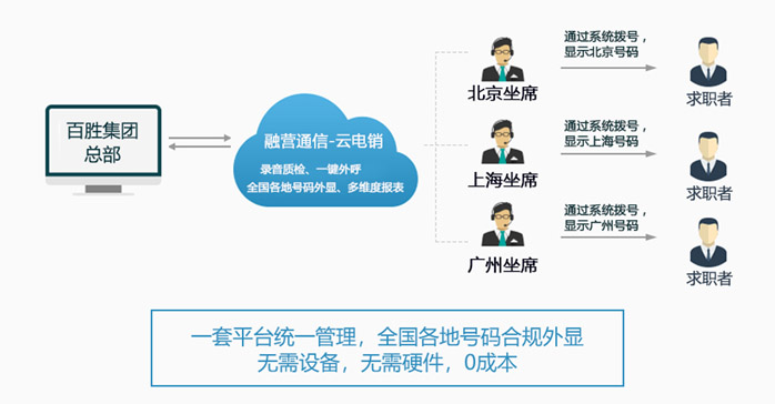 今年4月,融营通信科技(上海)有限公司携手百胜中国,为其打造全新的“云端”智能招聘呼叫平台。融营通信凭借搭建低成本、高效率、线路正规的云电销系统,成功的解决了百胜中国在招聘过程中,因电话呼出/呼入而引发的招聘难题。自融营通信成立以来,一直致力于为企业提供“私人订制”的云呼叫服务,根据不同的客户需求提供相应的解决方案: