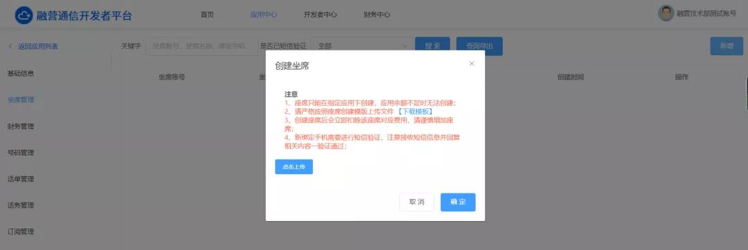 在应用内的【坐席管理】处根据模板要求完成坐席创建,平台会同时扣除相应坐席的月租费用,新创建的坐席绑定手机需要进行第一次短信验证回复后才可使用。
