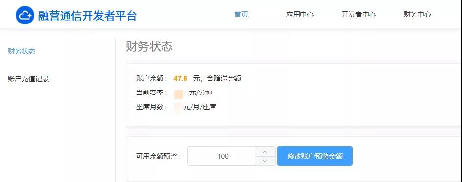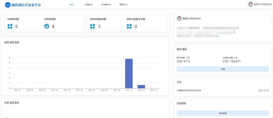 目前,云通信开发者平台配备了三大实用模块功能,分别为应用中心、开发者中心以及财务中心,部分基础数据可以直接在开发者平台首页进行预览。