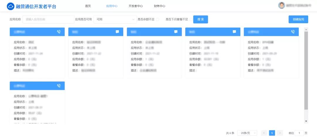 应用中心:在开发者平台成功创建的所有应用将被全部集中展示于此模块,用户可通过输入相关的应用名称来进行定向搜索,也可通过一定的检索条件来快速筛查需要上线或充值的应用。