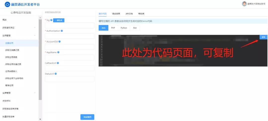 对于企业技术人员而言,云通信开发者平台支持一键生成功能模块的代码参数,让技术人员在无需自主撰写编码的前提下就可完成应用创建,有效减免了冗长复杂的开发与调试时间。