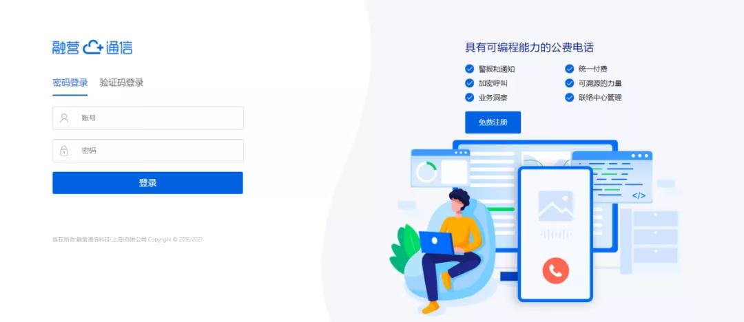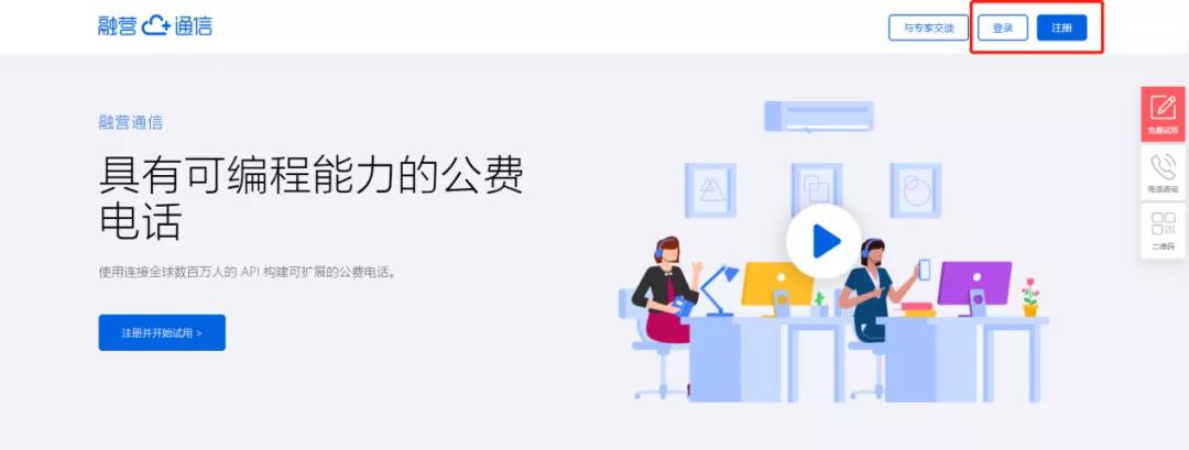 登录融营通信公费电话官网(https://paas.yuntongxin.vip),点击右上角注册按钮填写相关信息,并按要求在云端完成实名认证。 已有账户的企业可直接点击登录按钮,页面会跳转至登录界面。