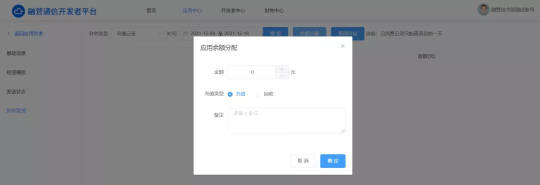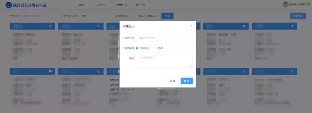 进入【应用中心】模块后点击右上角【创建应用】,完成相关内容填充及选择后即视为创建成功。 随后请在该应用内的【财务管理】处进行余额充值,以保证账户的正常使用。