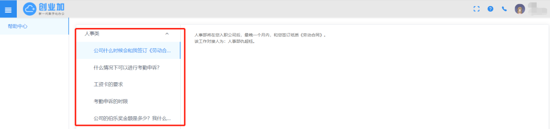为帮助新入职员工快速了解工作中的常见疑惑,新版本的创业加BPM在HR模块中新增【帮助中心】功能, 管理者可以收集一些询问度较高的问题及解决方案收纳于此,便于员工在此直接查询,免去了对相关部门重复询问、重复解答的过程。 此功能虽位于HR模块,但全员均有权限进入查阅