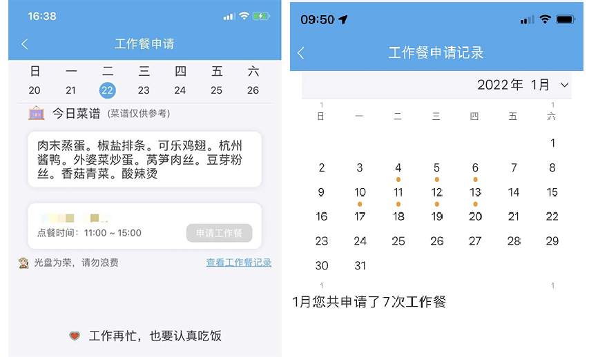 自创业加APP上线【工作餐】功能后,不少使用者表示希望系统可以对每月的订餐数量进行统计,便于员工了解当月的用餐情况。 鉴于这一需求,新版本的创业加APP已成功修复工作餐记录不显示等问题,优化员工对于移动端的使用体验。