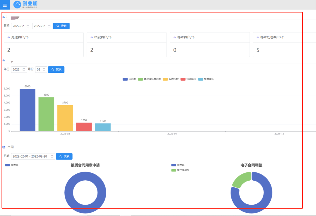 在新版本的创业加BPM中,法务部的首页门户也得到全面完善,现下,法务部的员工能在首页直接搜索相关时间内的事务概况,针对性地去优先处理较为紧急的项目。