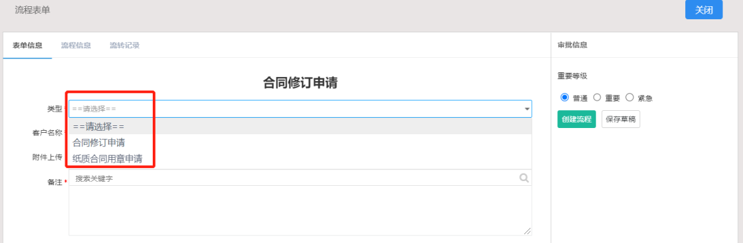 流程模块方面新增了【电子合同调整申请】,帮助员工快速在线处理电子类合同问题。另外,【合同修订申请】中的类型选择也得到了优化, 目前设有【合同修订申请】【纸质合同用章申请】两类可供选择。