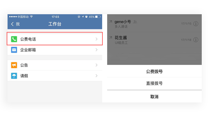 1. 在“工作台”列表中点击“公费电话”进入应用首页,再点击右上角按钮选择公费拨号或直接拨号进行呼叫