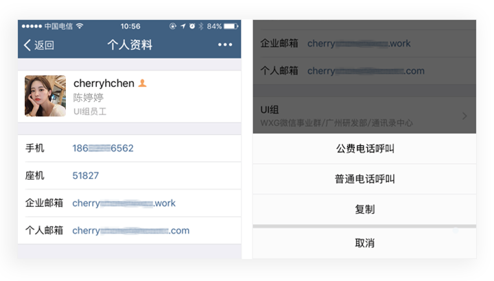 2. 也可以进入企业成员个人资料,点击手机号码,选择公费电话呼叫
