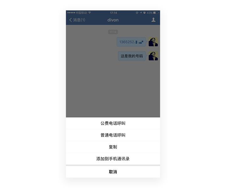 3. 点击会话中的电话号码,选择公费电话呼叫